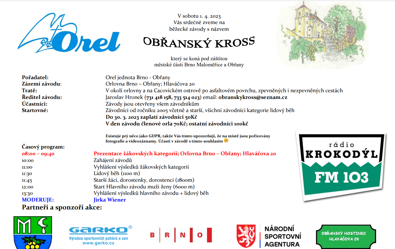 Orel jednota Brno - Obřany vás srdečně zve na běžecké závody "Obřanský kross" které se konají v sobotu 1. 4. 2023